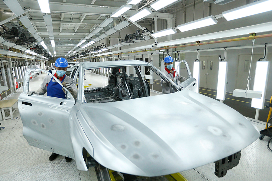 Workers conduct quality checks at the factory of an automobile manufacturer in Qingdao, Shandong province, in November. [PHOTO/XINHUA]