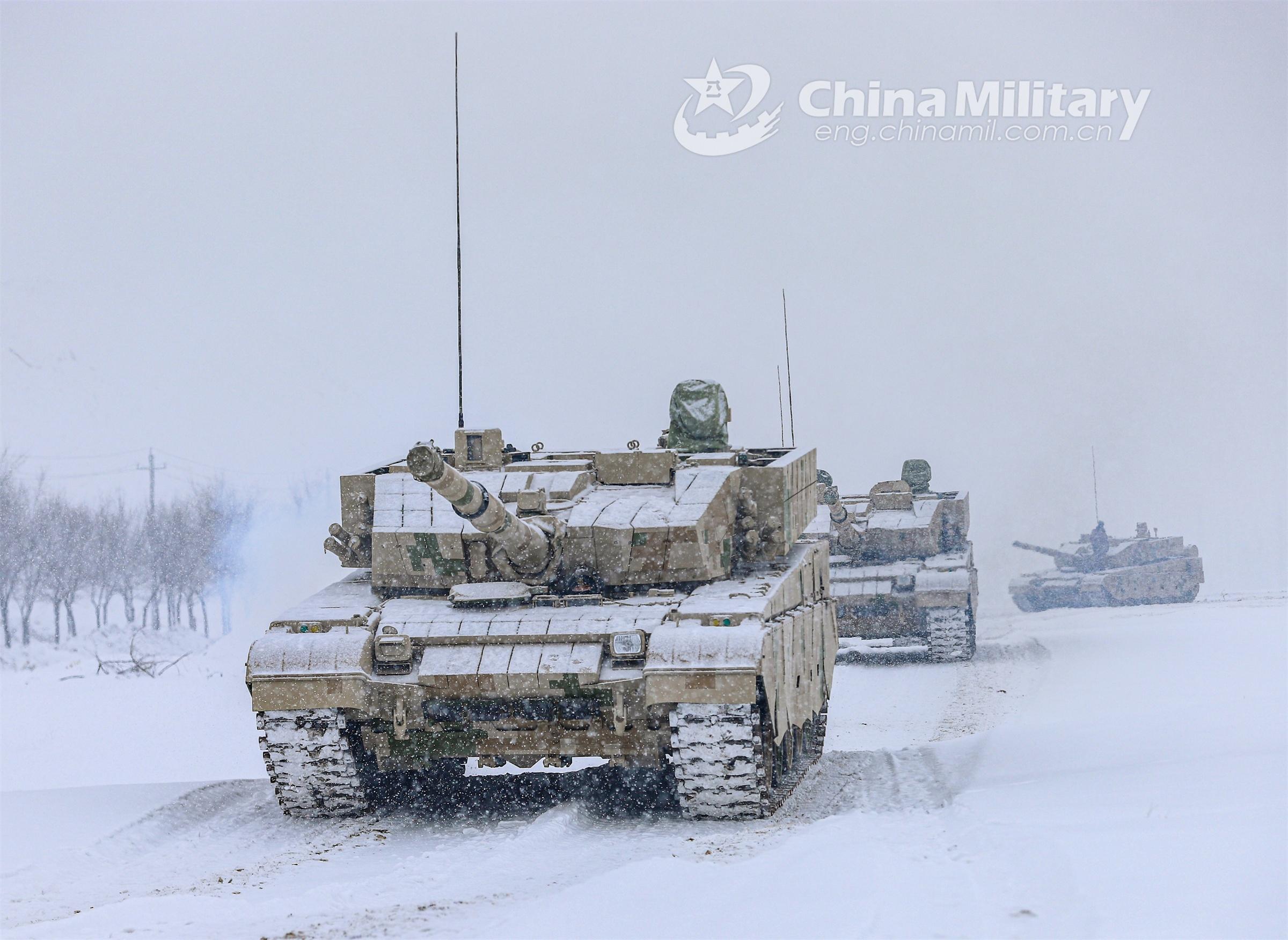 Main battle tanks attached to a tank element of the army rumble through snowfield during a training exercise in late-January, 2023. (eng.chinamil.com.cn/Photo by He Rui)
