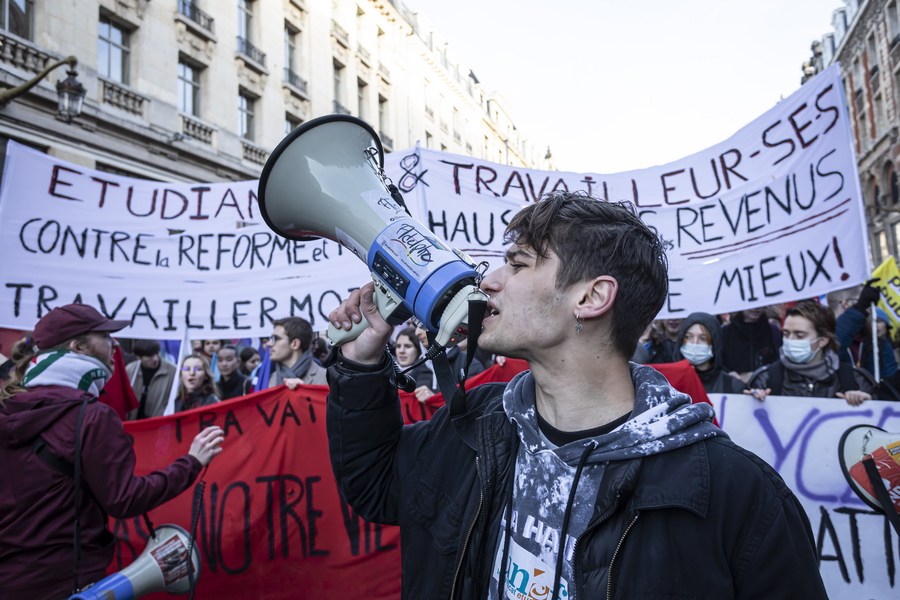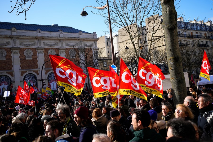 People participate in a protest against the government's controversial pension reform plan in Paris, France, on Jan. 31, 2023. (Photo by Glenn Gervot/Xinhua)