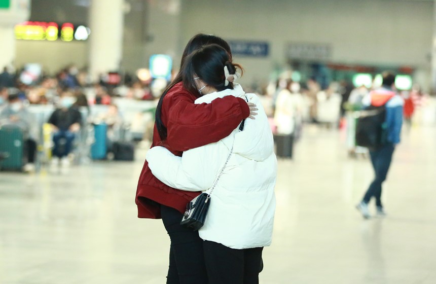 Friends hug each other at the waiting room of the Nanchang Railway Station in Nanchang, east China's Jiangxi Province. (Photo/Lu Yao)
