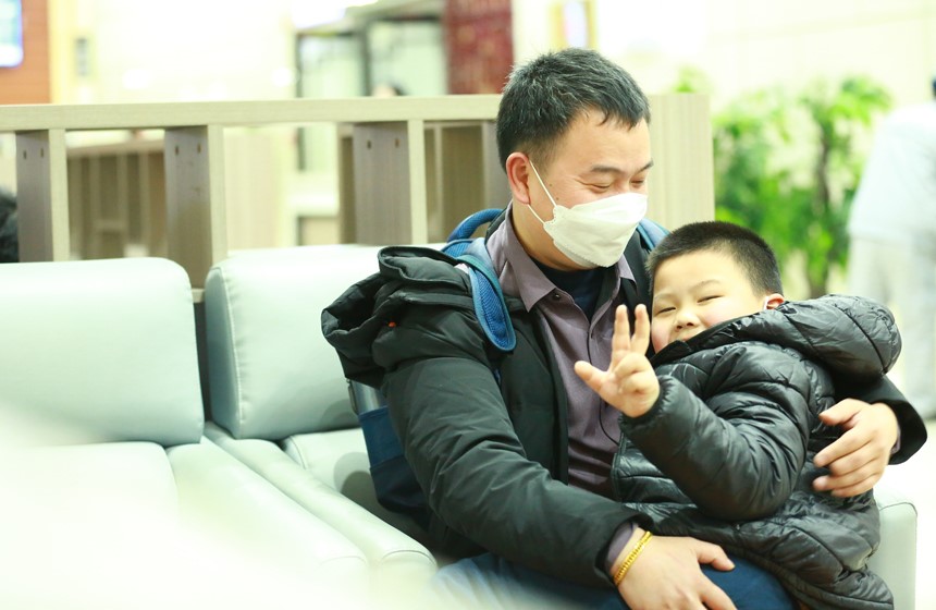 Photo shows a father with his son waiting to board a train at the Nanchang Railway Station in Nanchang, east China's Jiangxi Province. (Photo/Lu Yao)