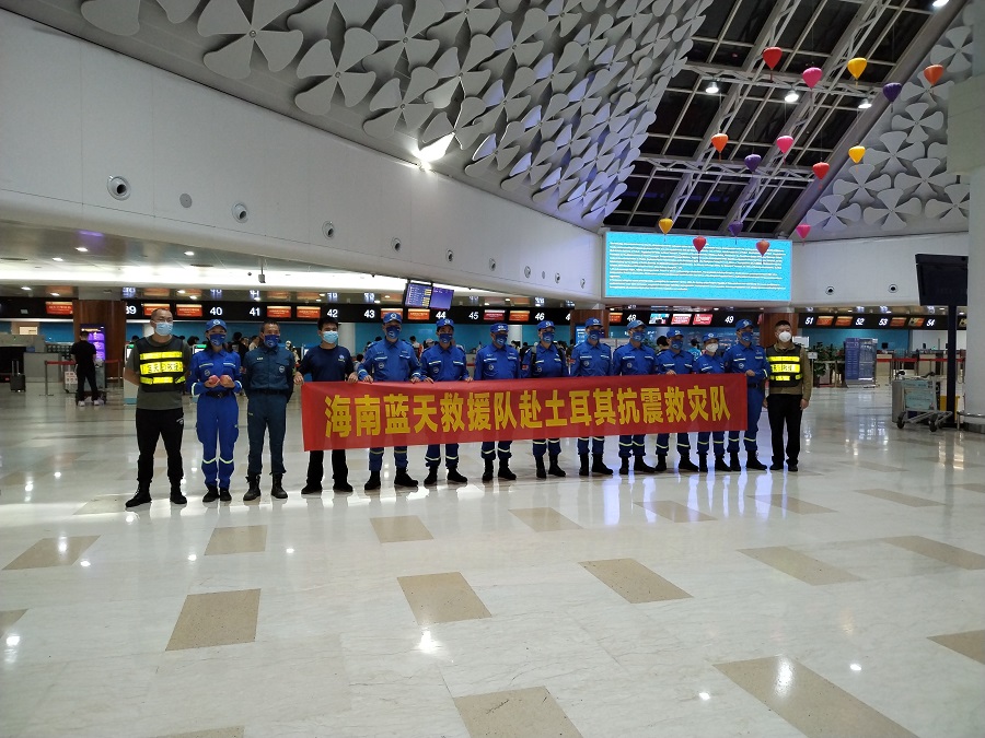 Photos shows members of Hainan Blue Sky Rescue Team at the Haikou Airport in South China’s Hainan Province before setting off to Türkiye. (Photo provided by Hainan Blue Sky Rescue Team)