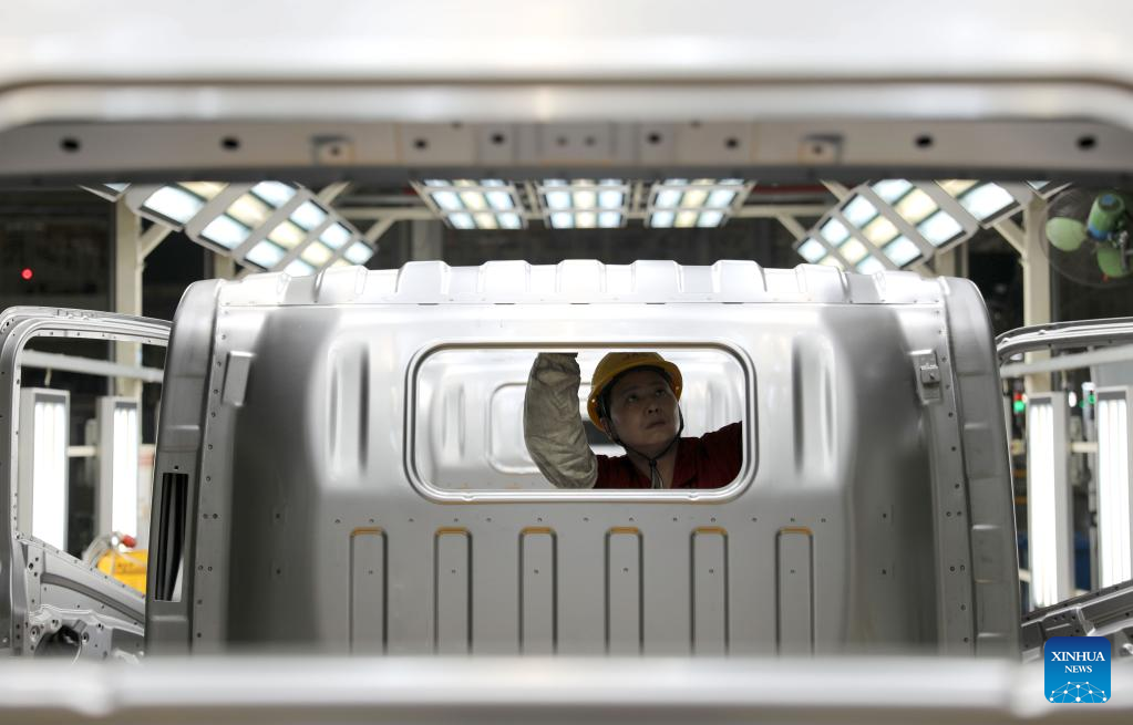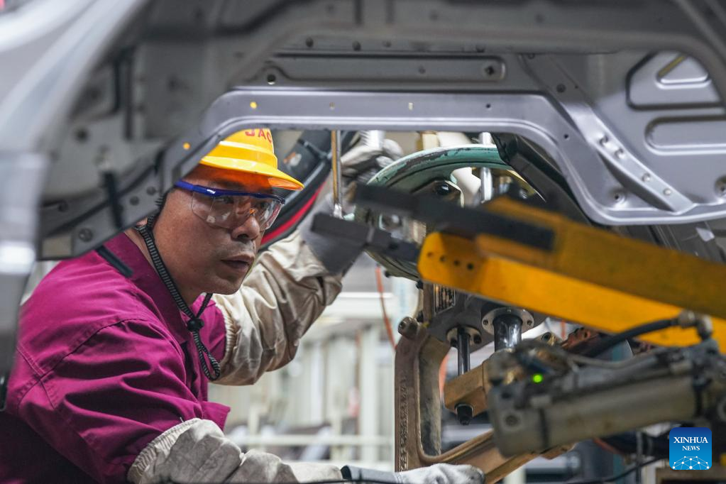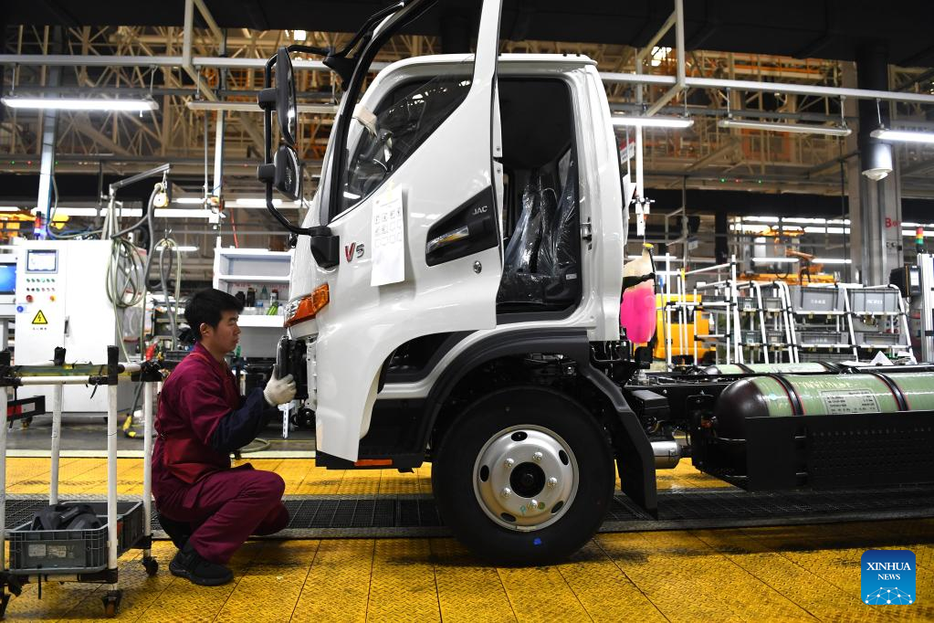 An employee works on a truck assembly line at a production base of Anhui Jianghuai Automobile Group Corp. Ltd. in Hefei, east China's Anhui Province, Feb. 8, 2023. (Xinhua/Liu Junxi)