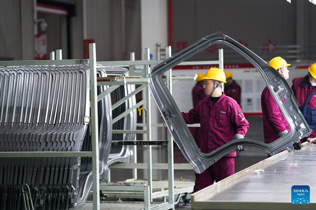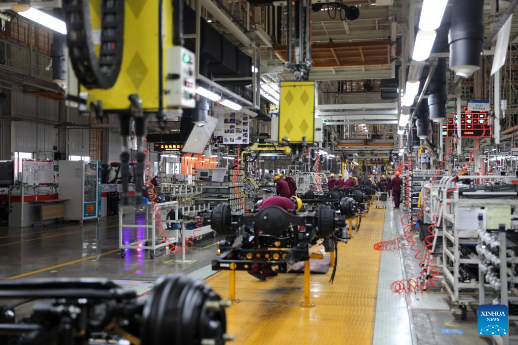 Employees work on a truck assembly line at a production base of Anhui Jianghuai Automobile Group Corp. Ltd. in Hefei, east China's Anhui Province, Feb. 8, 2023. (Xinhua/Du Yu)