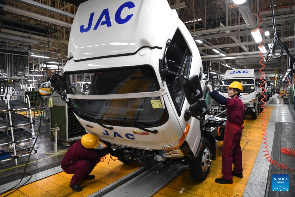 Employees work on a truck assembly line at a production base of Anhui Jianghuai Automobile Group Corp. Ltd. in Hefei, east China's Anhui Province, Feb. 8, 2023. (Xinhua/Liu Junxi)