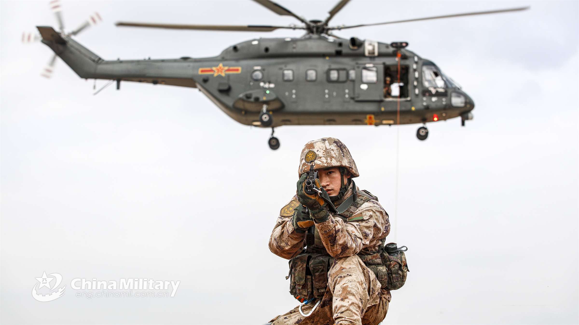 A soldier assigned to an army brigade provides simulated security after disembarking from a helicopter during an air-ground training exercise recently. (eng.chinamil.com.cn/Photo by Sun Changyi)