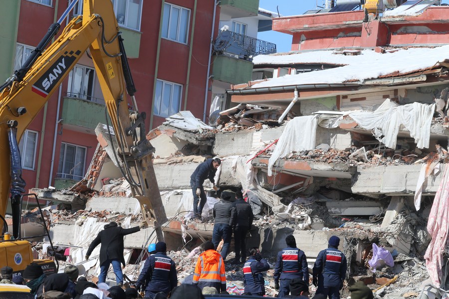Rescuers search for survivors among the rubble of a building destroyed in quake-hit Besni District of Adiyaman Province, Türkiye, Feb. 8, 2023. (Photo by Mustafa Kaya/Xinhua)