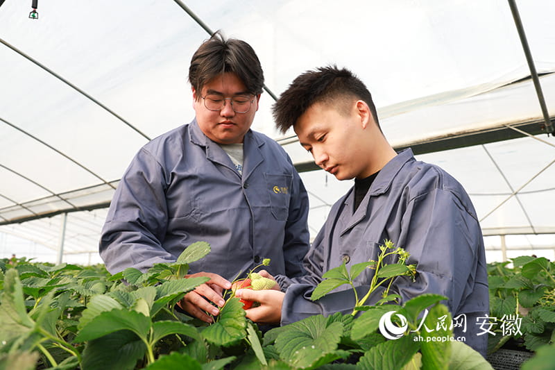 Zhu and Li check the conditions of strawberries. (People’s Daily Online/Zhang Jun)