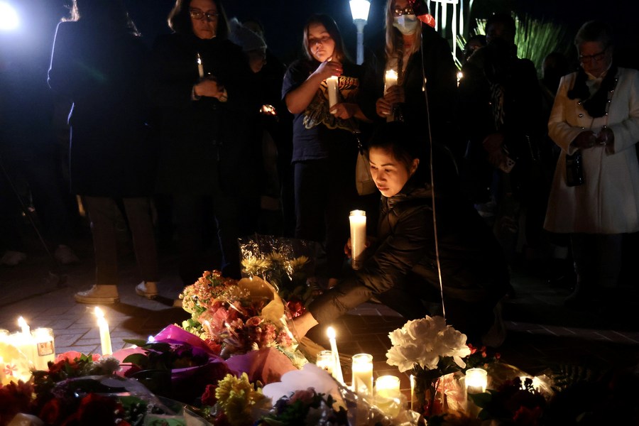 People mourn with candles for victims of a mass shooting in front of the city hall of Monterey Park, California, the United States, on Jan. 23, 2023. (Xinhua)