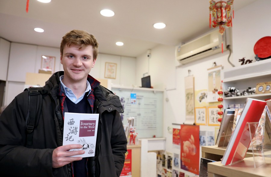 Jack Flowers shows his newly bought simplified version of Journey to the West, one of the four classics of Chinese literature, at the Guanghwa Bookshop in London, Britain, Jan. 24, 2023. (Xinhua/Li Ying)