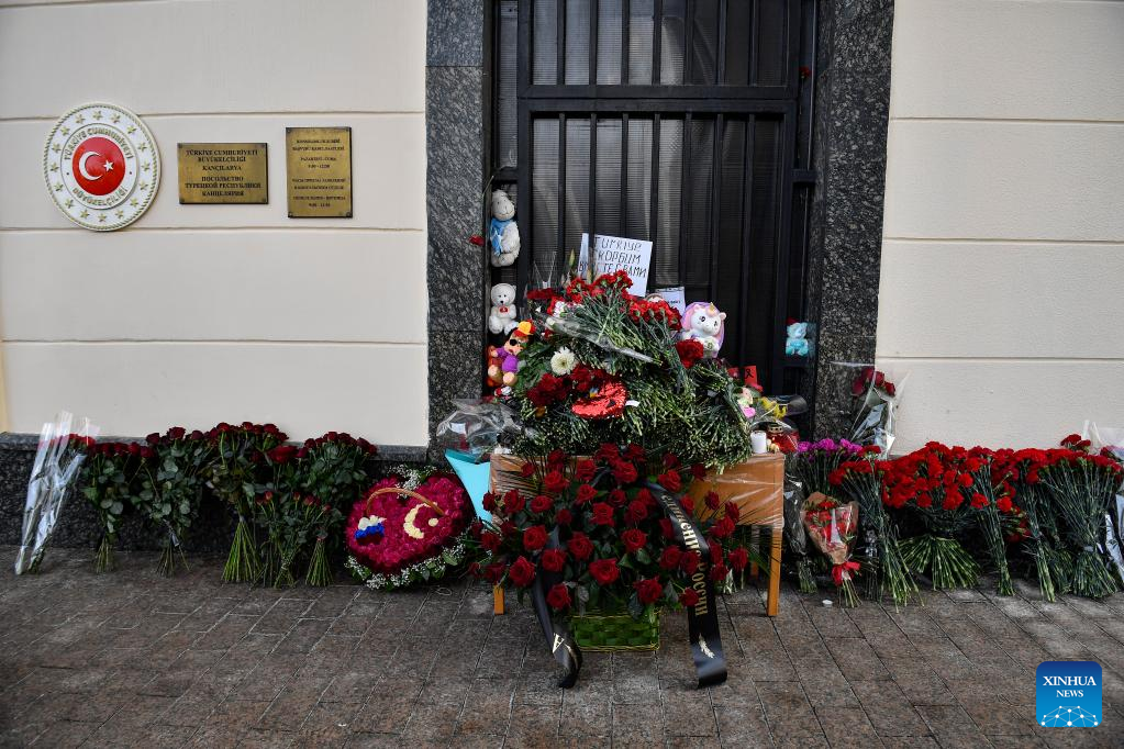 Flowers in commemoration of victims of recent earthquakes in Trkiye are pictured at the Turkish Embassy in Moscow, Russia, on Feb. 8, 2023. (Photo by Alexander Zemlianichenko Jr/Xinhua)