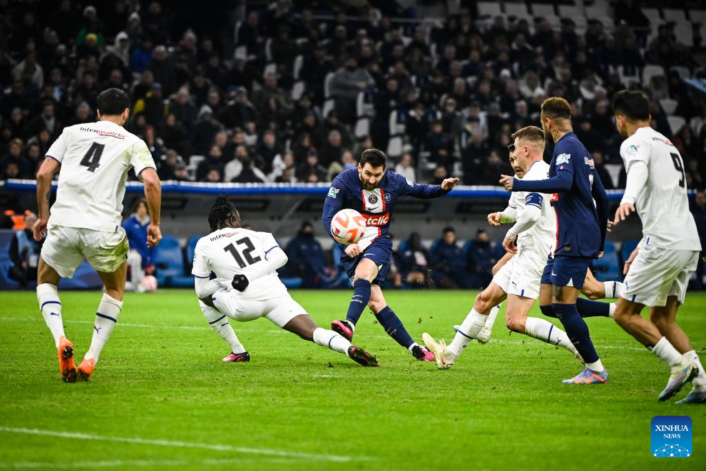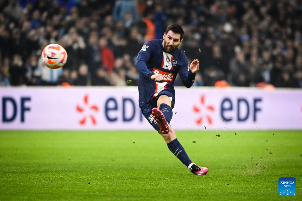 Paris Saint-Germain's Lionel Messi (3rd L) shoots during the French Cup round of 16 football match between Olympique de Marseille (OM) and Paris Saint-Germain (PSG) at the Velodrome stadium in Marseille, Feb. 8, 2023. (Photo by Clement Mahoudeau/Xinhua)