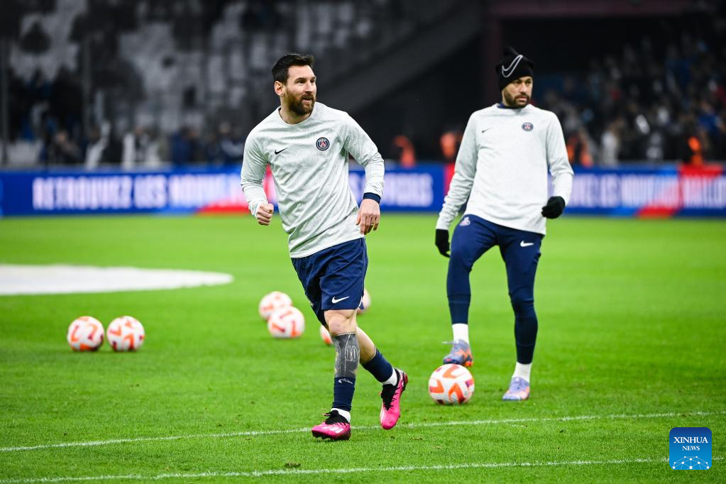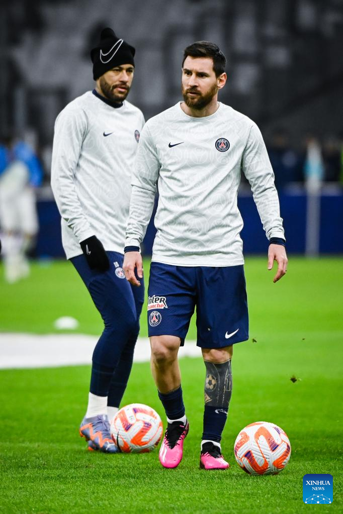 Paris Saint-Germain's Neymar (R) and Lionel Messi warm up before the French Cup round of 16 football match between Olympique de Marseille (OM) and Paris Saint-Germain (PSG) at the Velodrome stadium in Marseille, Feb. 8, 2023. (Photo by Clement Mahoudeau/Xinhua)