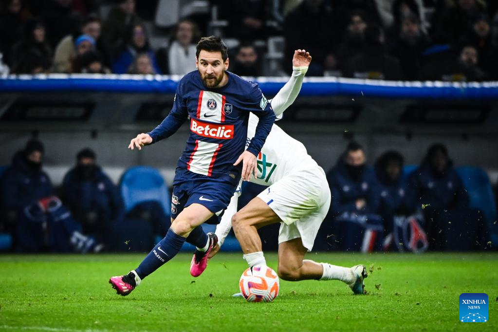 Paris Saint-Germain's Lionel Messi (L) competes during the French Cup round of 16 football match between Olympique de Marseille (OM) and Paris Saint-Germain (PSG) at the Velodrome stadium in Marseille, Feb. 8, 2023. (Photo by Clement Mahoudeau/Xinhua)