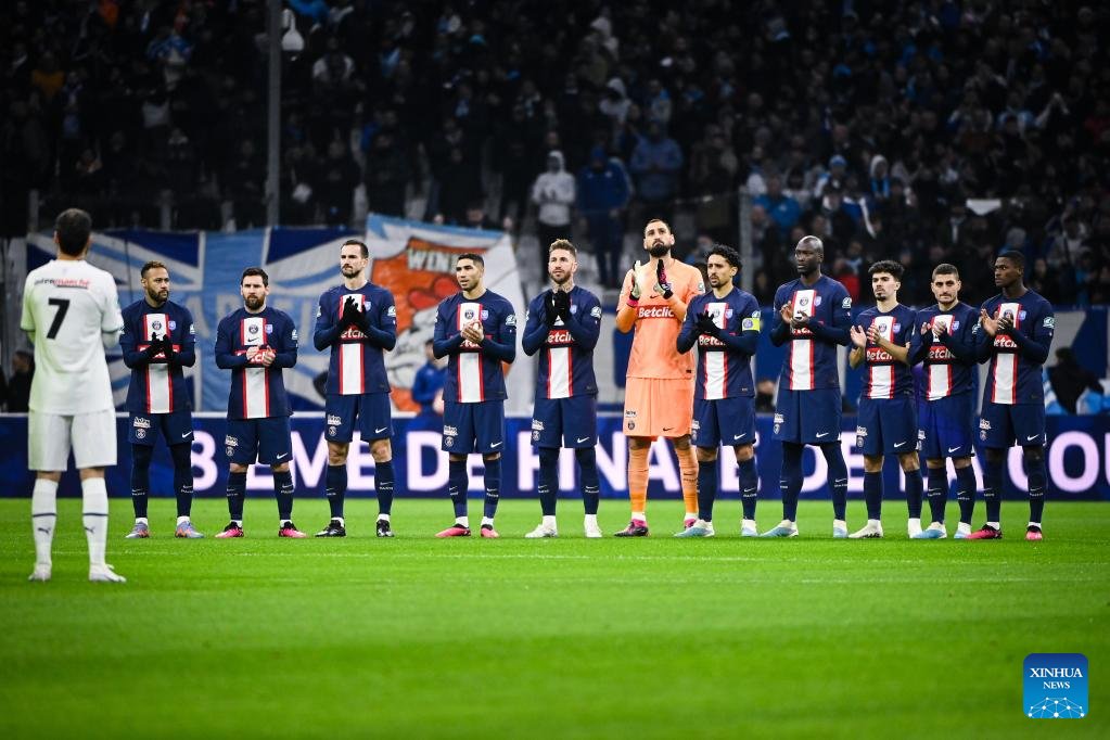 Paris Saint-Germain's players stand for a minute silence for the victims of an earthquake in Trkiye and Syria before the French Cup round of 16 football match between Olympique de Marseille (OM) and Paris Saint-Germain (PSG) at the Velodrome stadium in Marseille, Feb. 8, 2023. (Photo by Clement Mahoudeau/Xinhua)