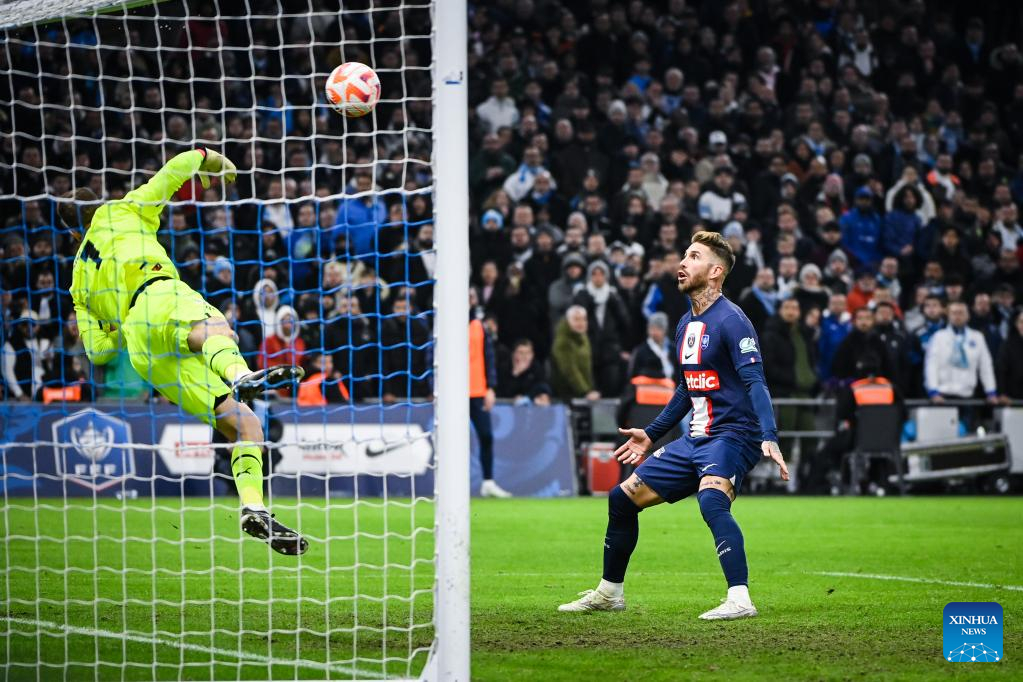 Paris Saint-Germain's Sergio Ramos (R) reacts during the French Cup round of 16 football match between Olympique de Marseille (OM) and Paris Saint-Germain (PSG) at the Velodrome stadium in Marseille, Feb. 8, 2023. (Photo by Clement Mahoudeau/Xinhua)