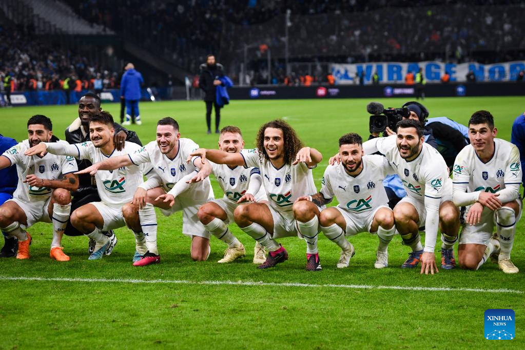 Marseille's players celebrate their victory after the French Cup round of 16 football match between Olympique de Marseille (OM) and Paris Saint-Germain (PSG) at the Velodrome stadium in Marseille, Feb. 8, 2023. (Photo by Clement Mahoudeau/Xinhua)