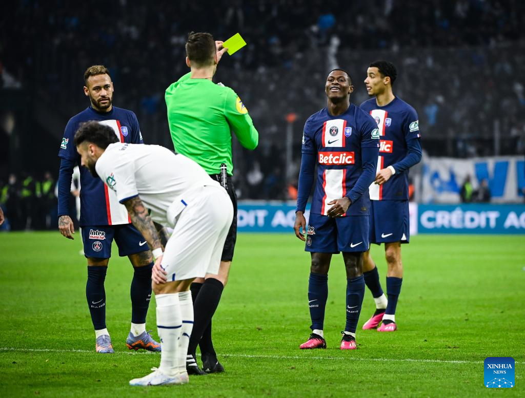 Paris Saint-Germain's Nuno Mendes (2nd R) receives a yellow card during the French Cup round of 16 football match between Olympique de Marseille (OM) and Paris Saint-Germain (PSG) at the Velodrome stadium in Marseille, Feb. 8, 2023. (Photo by Clement Mahoudeau/Xinhua)