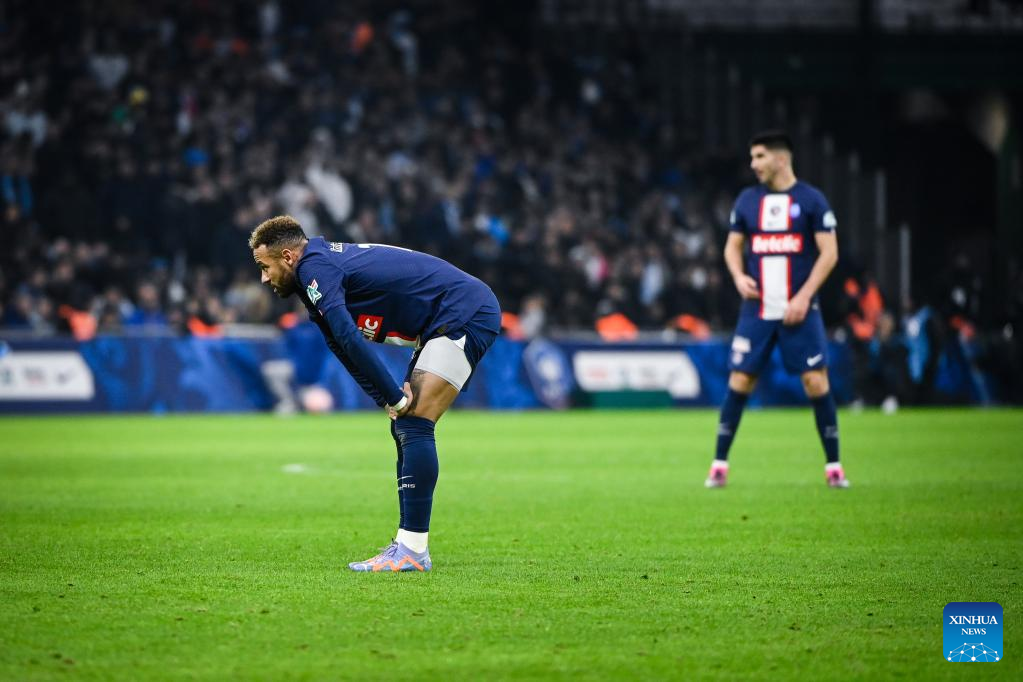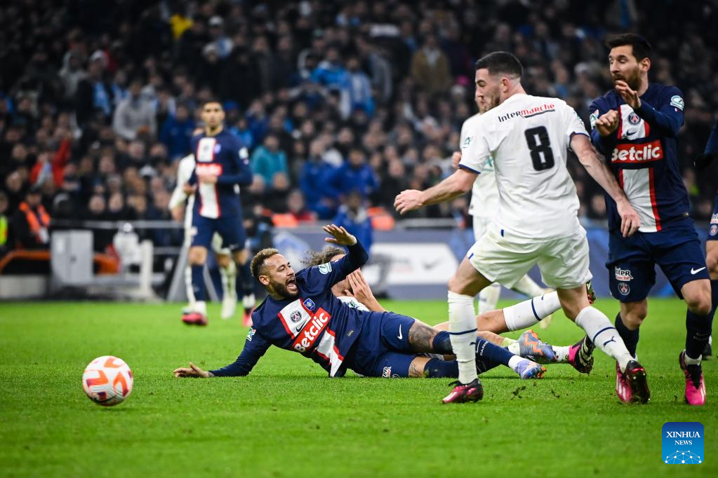 Paris Saint-Germain's Neymar (1st L) falls down during the French Cup round of 16 football match between Olympique de Marseille (OM) and Paris Saint-Germain (PSG) at the Velodrome stadium in Marseille, Feb. 8, 2023. (Photo by Clement Mahoudeau/Xinhua)