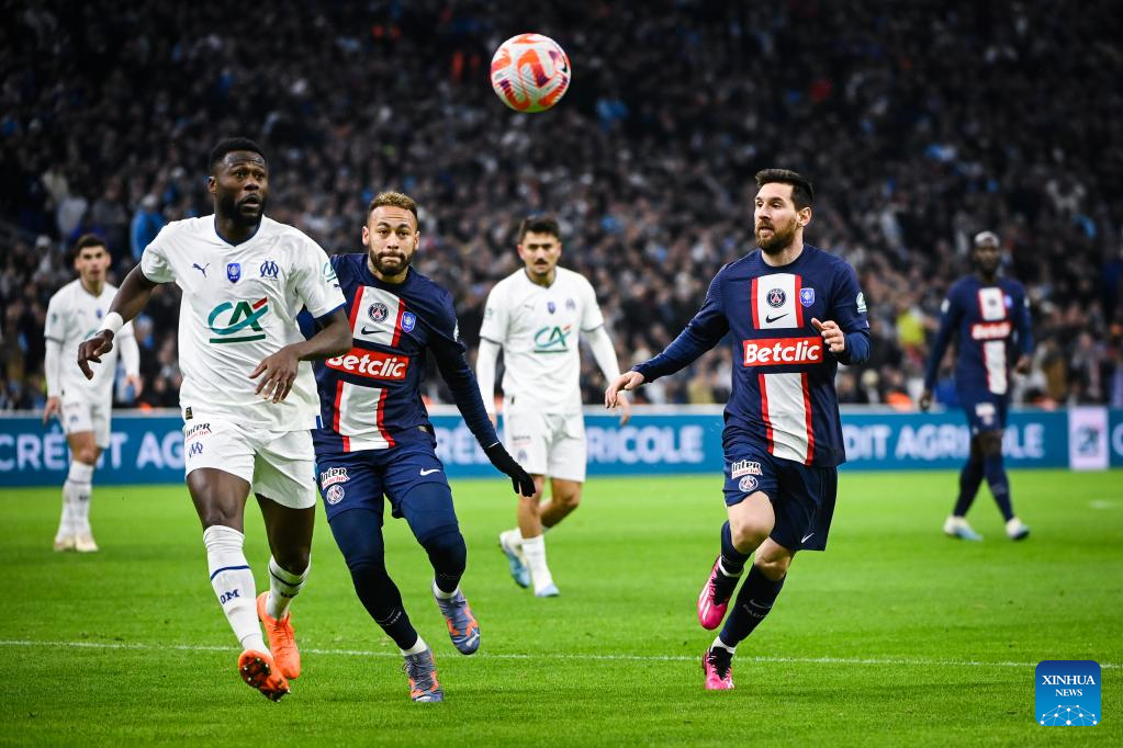 Paris Saint-Germain's Neymar (front C) and Lionel Messi (front R) compete during the French Cup round of 16 football match between Olympique de Marseille (OM) and Paris Saint-Germain (PSG) at the Velodrome stadium in Marseille, Feb. 8, 2023. (Photo by Clement Mahoudeau/Xinhua)