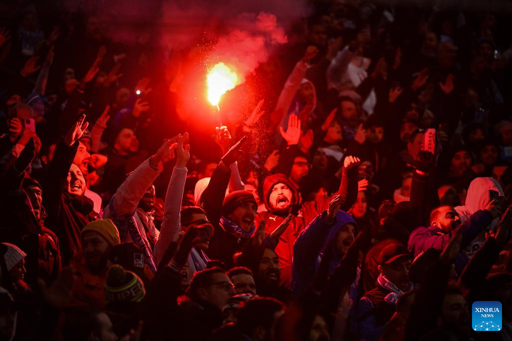 Olympique de Marseille supporters are seen before the French Cup round of 16 football match between Olympique de Marseille (OM) and Paris Saint-Germain (PSG) at the Velodrome stadium in Marseille, Feb. 8, 2023. (Photo by Clement Mahoudeau/Xinhua)
