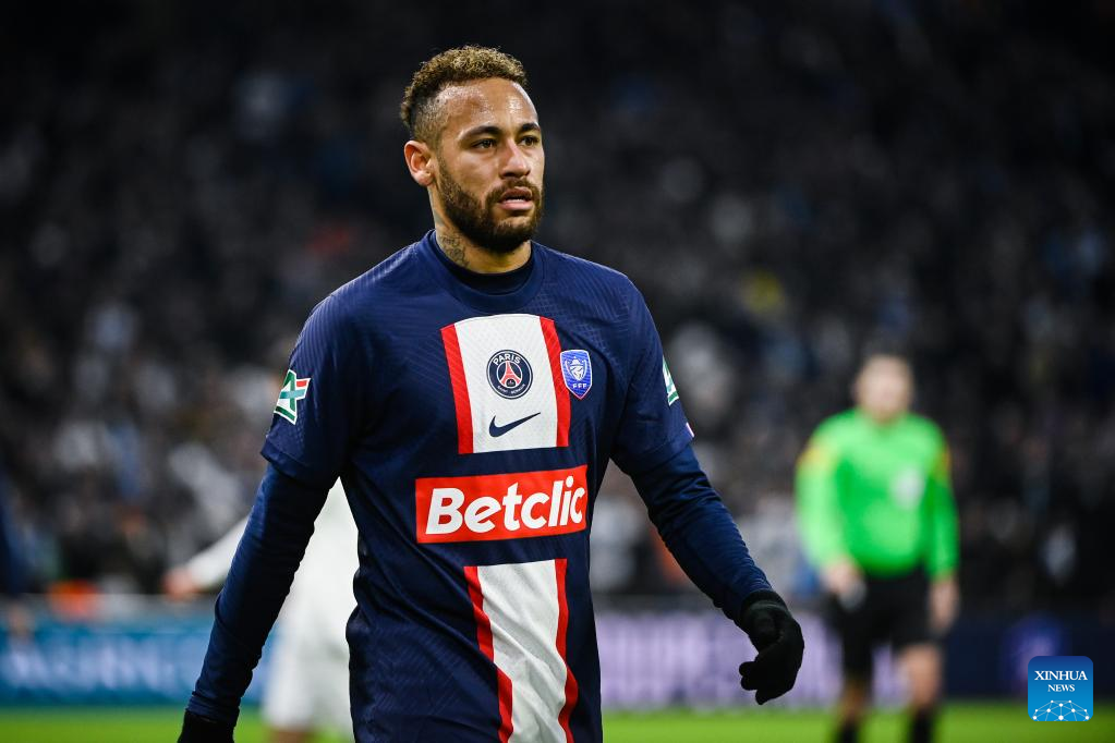 Paris Saint-Germain's Neymar reacts during the French Cup round of 16 football match between Olympique de Marseille (OM) and Paris Saint-Germain (PSG) at the Velodrome stadium in Marseille, Feb. 8, 2023. (Photo by Clement Mahoudeau/Xinhua)