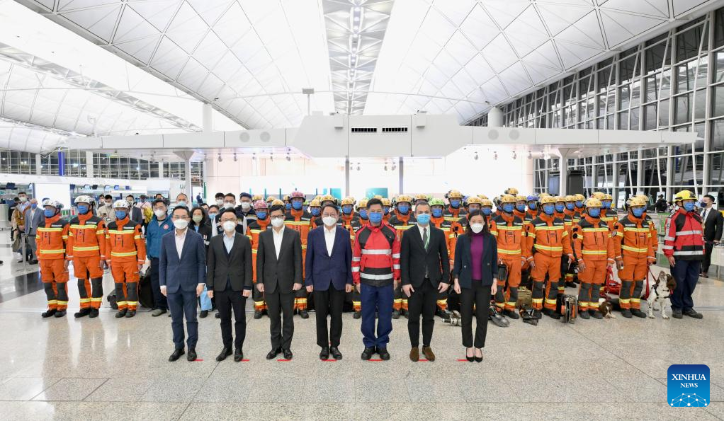 Chan Kwok-ki (C, front), acting chief executive of the Hong Kong Special Administrative Region (HKSAR), and Chris Tang Ping-keung (3rd L, front), secretary for security of HKSAR, pose for photos with members of a rescue team at the Hong Kong International Airport in Hong Kong, south China, Feb. 8, 2023. China's Hong Kong Special Administrative Region (HKSAR) government said on Wednesday that it has sent a search and rescue team of 59 members to earthquake-hit Trkiye. (Xinhua)