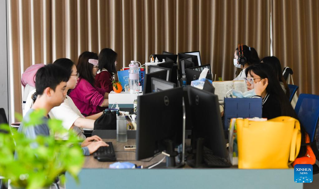 Employees work at an office in Fullsing Internet Industrial Park in Haikou, south China's Hainan Province, Feb. 8, 2023. In 2022, the key parks of Hainan Free Trade Port completed a total investment in fixed assets of 126.15 billion yuan (about 18.62 billion U.S. dollars), a year-on-year increase of 6.6 percent. The accumulated operating income was 1.82 trillion yuan (about 269.32 billion U.S. dollars), a year-on-year increase of 31.6 percent. (Xinhua/Yang Guanyu)