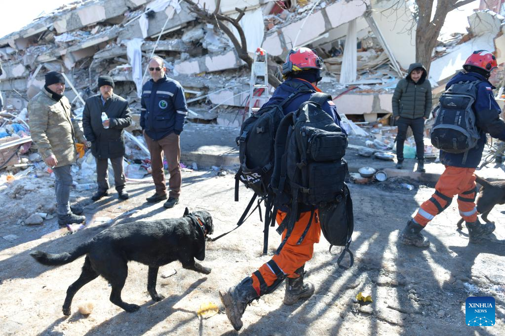 Rescuers carry out rescue operation with rescue dogs in Adiyaman, Trkiye, Feb. 8, 2023. The death toll from Monday's devastating earthquakes in Trkiye and Syria has surpassed 17,000, according to latest data. (Photo by Mustafa Kaya/Xinhua)