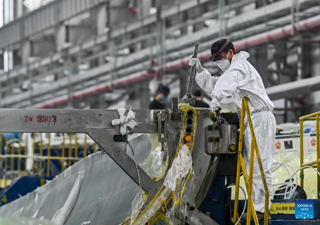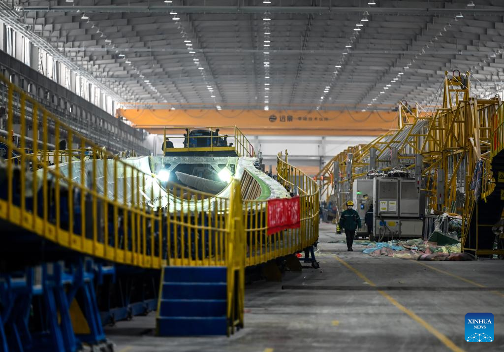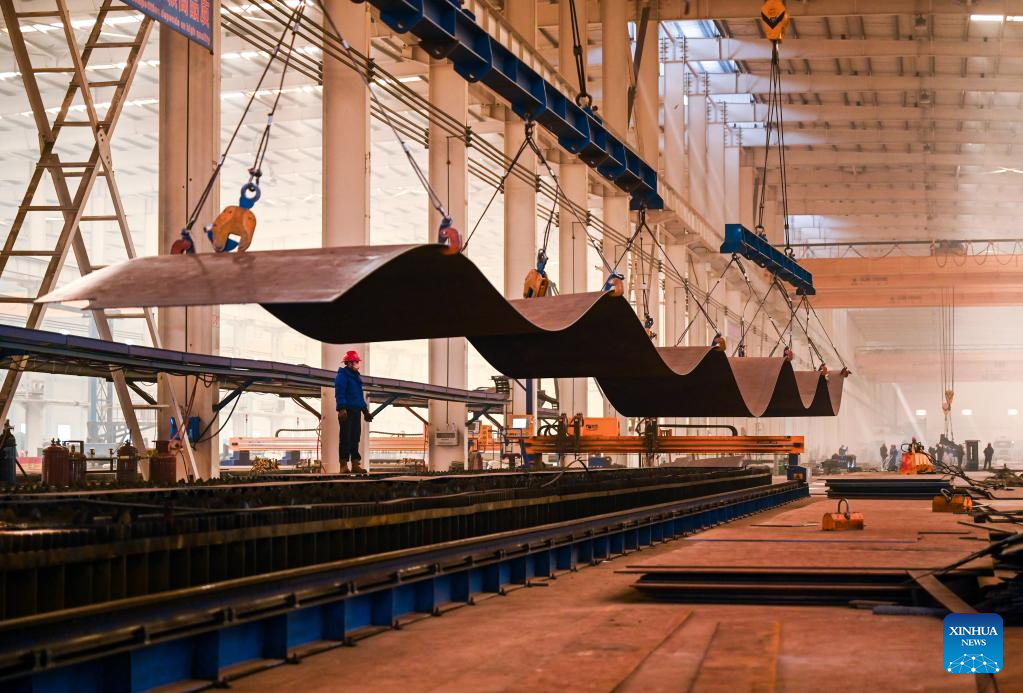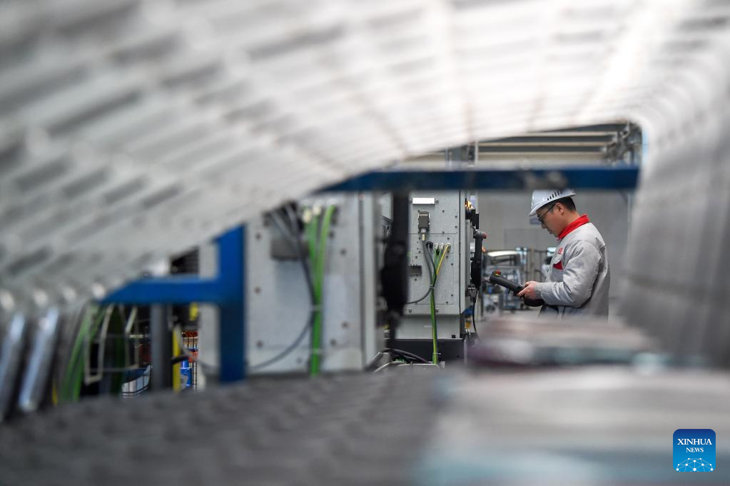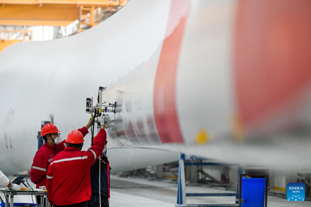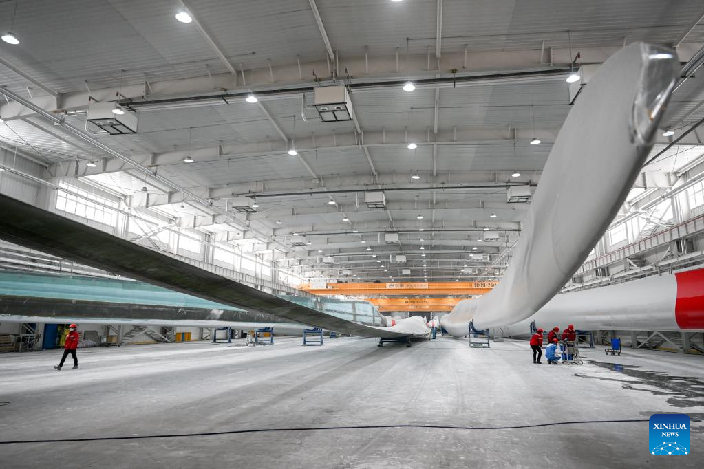 Staff members work at the production line of wind turbine blade at an energy company in Ulanqab, north China's Inner Mongolia Autonomous Region, Feb. 9, 2023. (Xinhua/Lian Zhen)