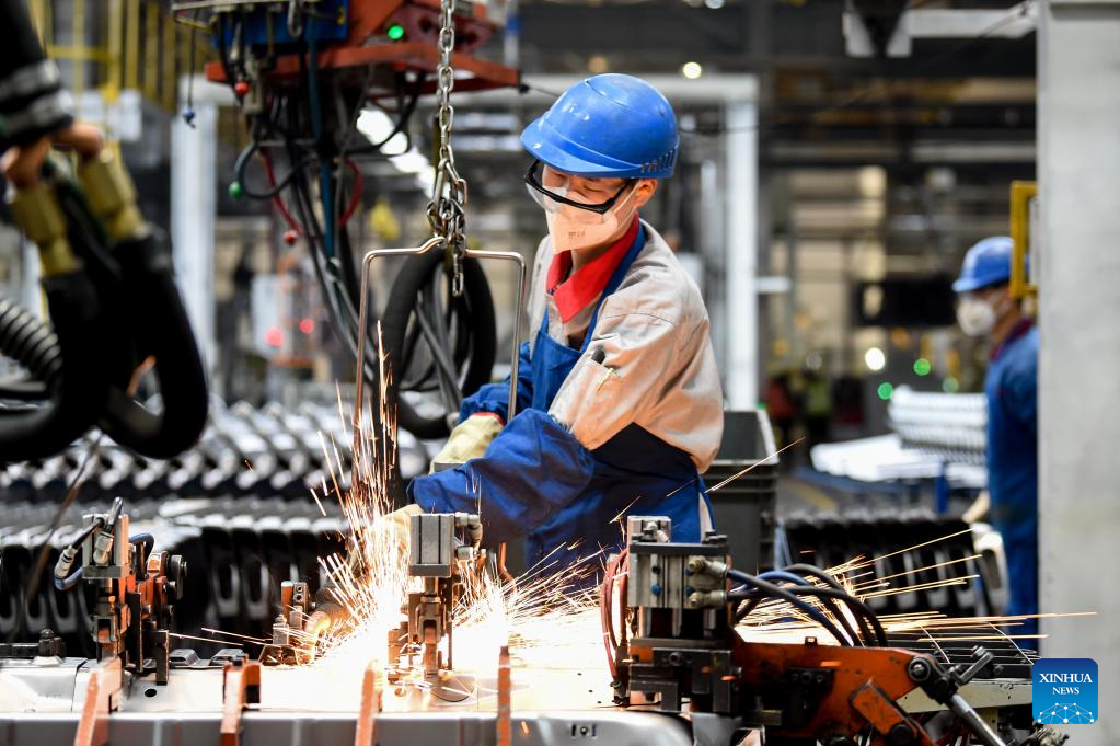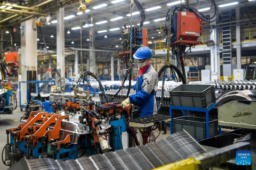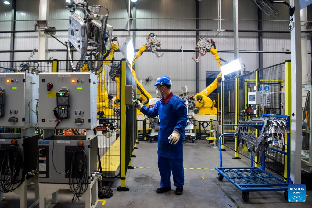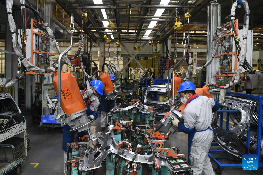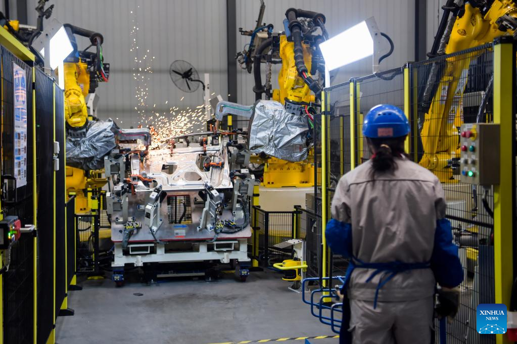 A staff member works at a factory of Chinese automaker Chery Holding Group Co., Ltd. in Erdos, north China's Inner Mongolia Autonomous Region, Feb. 9, 2023. (Xinhua/Li Zhipeng)