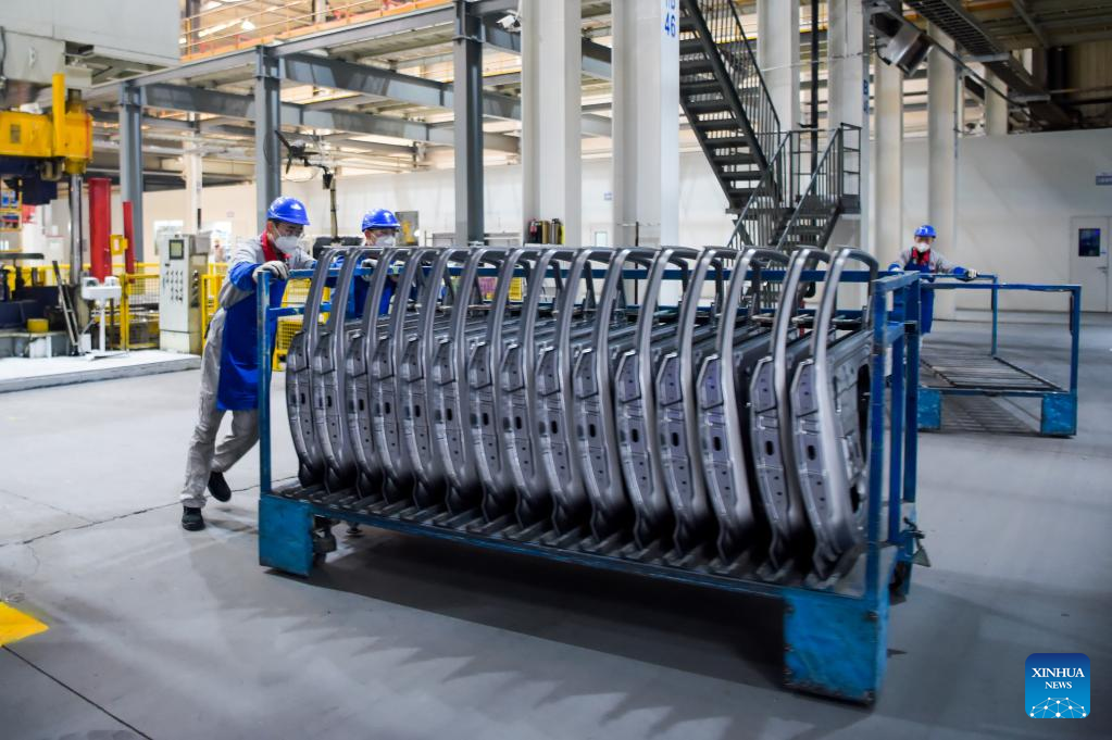 Staff members carry auto parts at a factory of Chinese automaker Chery Holding Group Co., Ltd. in Erdos, north China's Inner Mongolia Autonomous Region, Feb. 9, 2023. (Xinhua/Li Zhipeng)