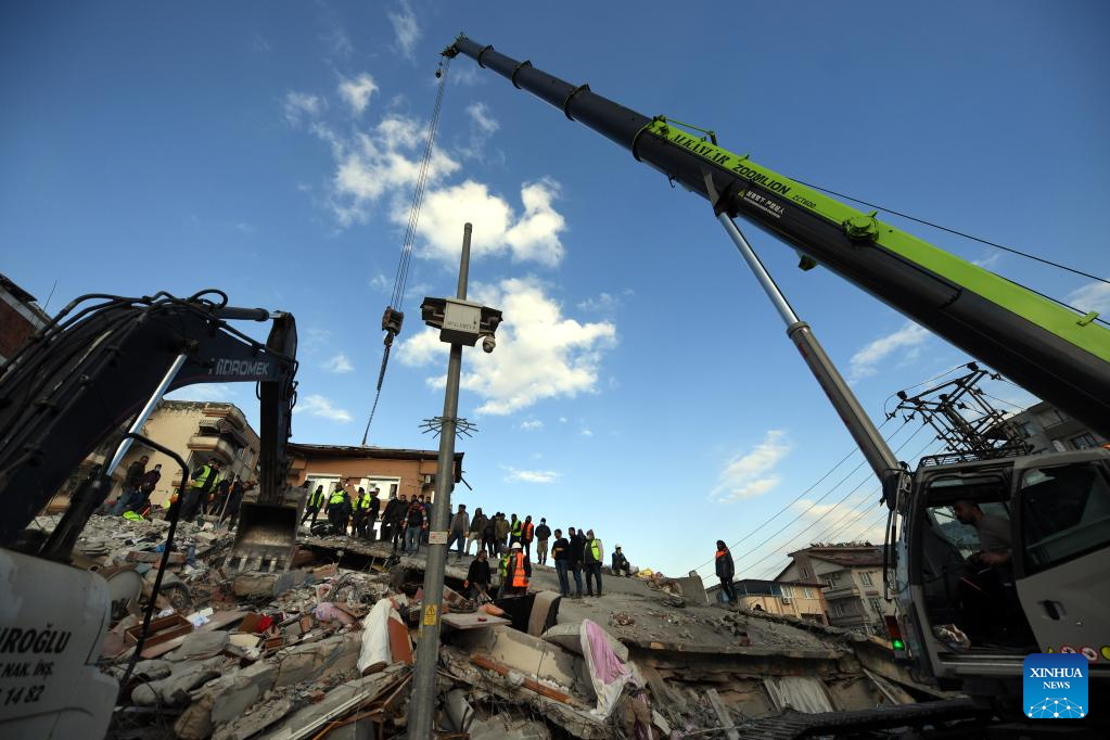Rescue workers search for survivors among the rubble of a destroyed building in Antakya, Hatay province, Trkiye, on Feb. 10, 2023. The death toll from Monday's devastating earthquakes climbed to 20,213 in Trkiye, while another 80,052 injuries were reported in the country, Turkish Health Minister Fahrettin Koca announced late Friday. (Xinhua/Shadati)
