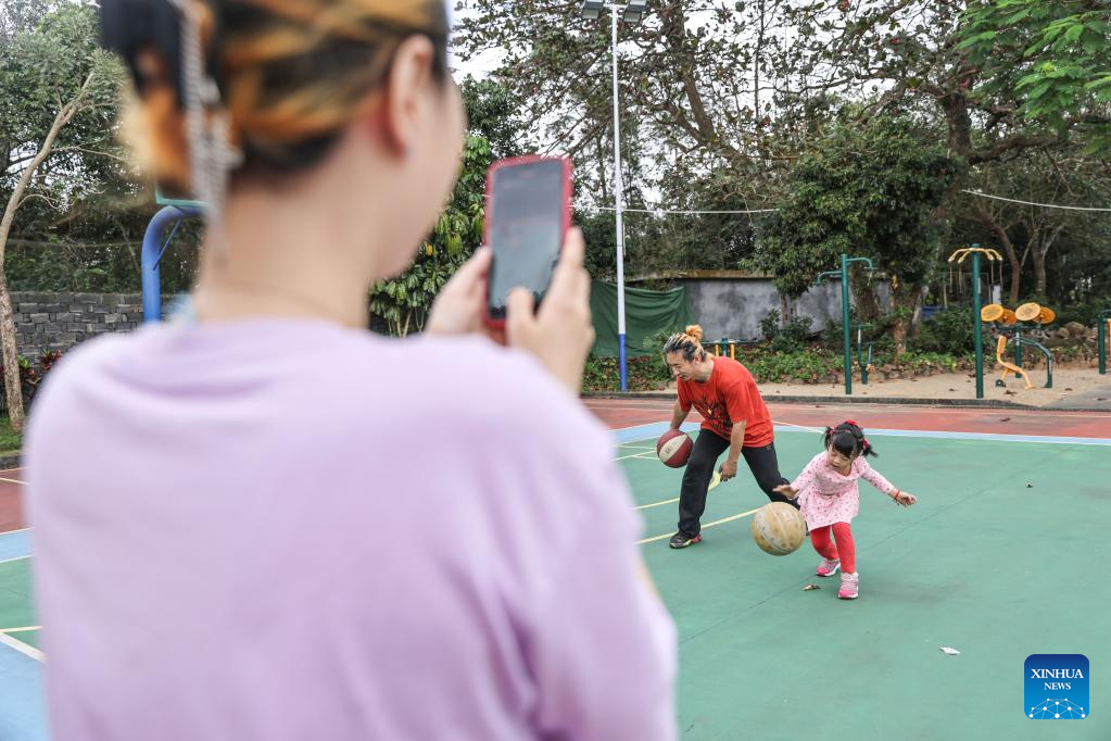 Cartoonist Liu Ke (C) plays with his family on the basketball court of a school in Changxue Village of Longqiao Town, Haikou City, south China's Hainan Province, Feb. 9, 2023. (Xinhua/Zhang Liyun)