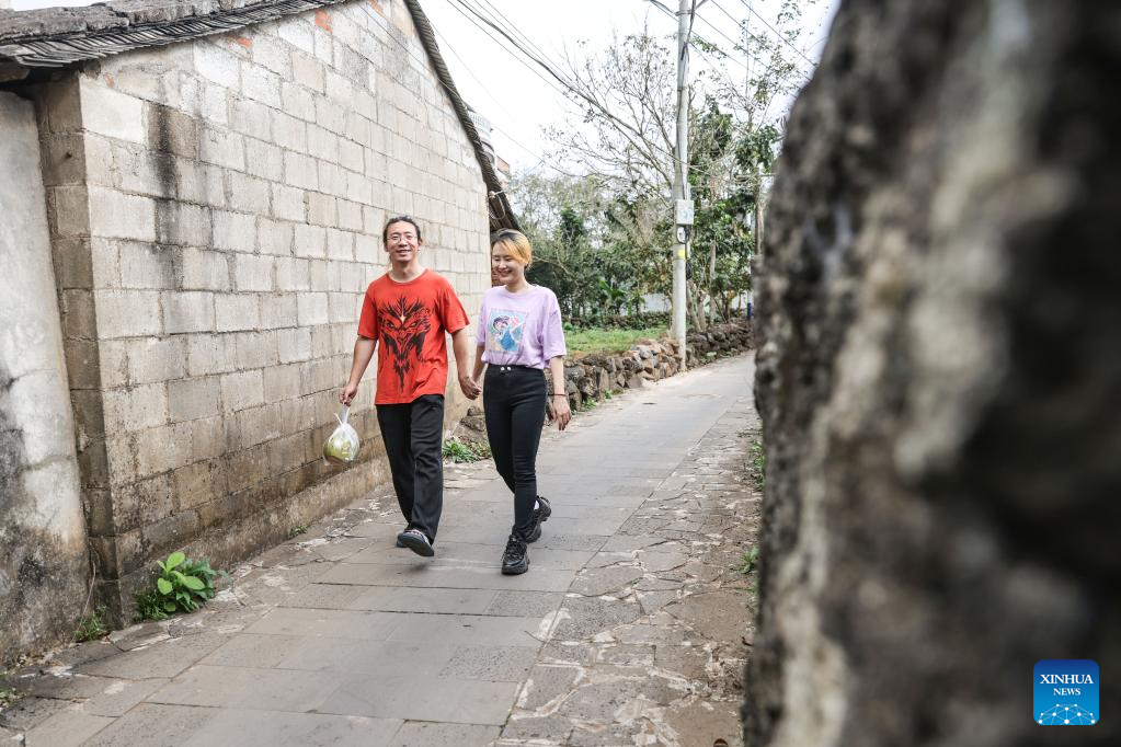 Cartoonist Liu Ke and his wife Meng Qingnan stroll in Changxue Village of Longqiao Town, Haikou City, south China's Hainan Province, Feb. 9, 2023. (Xinhua/Zhang Liyun)