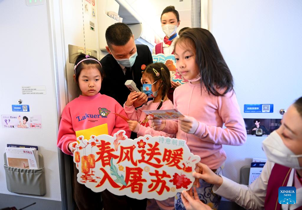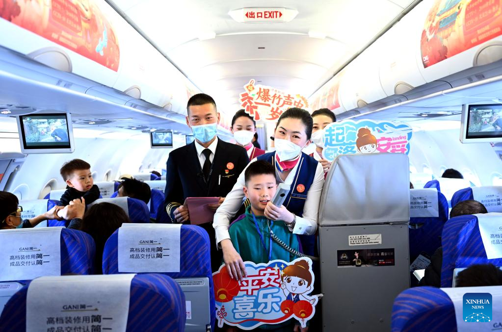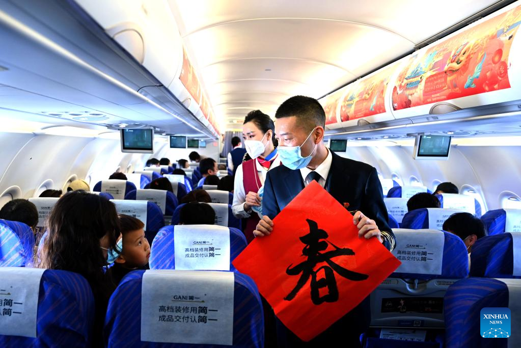 Ma Baoli (2nd L) plays a spring themed ancient poetry citing game with passengers during a flight from Dalian of northeast China's Liaoning Province to Guangzhou of south China's Guangdong Province, Feb. 4, 2023. (Xinhua/Jin Liangkuai)