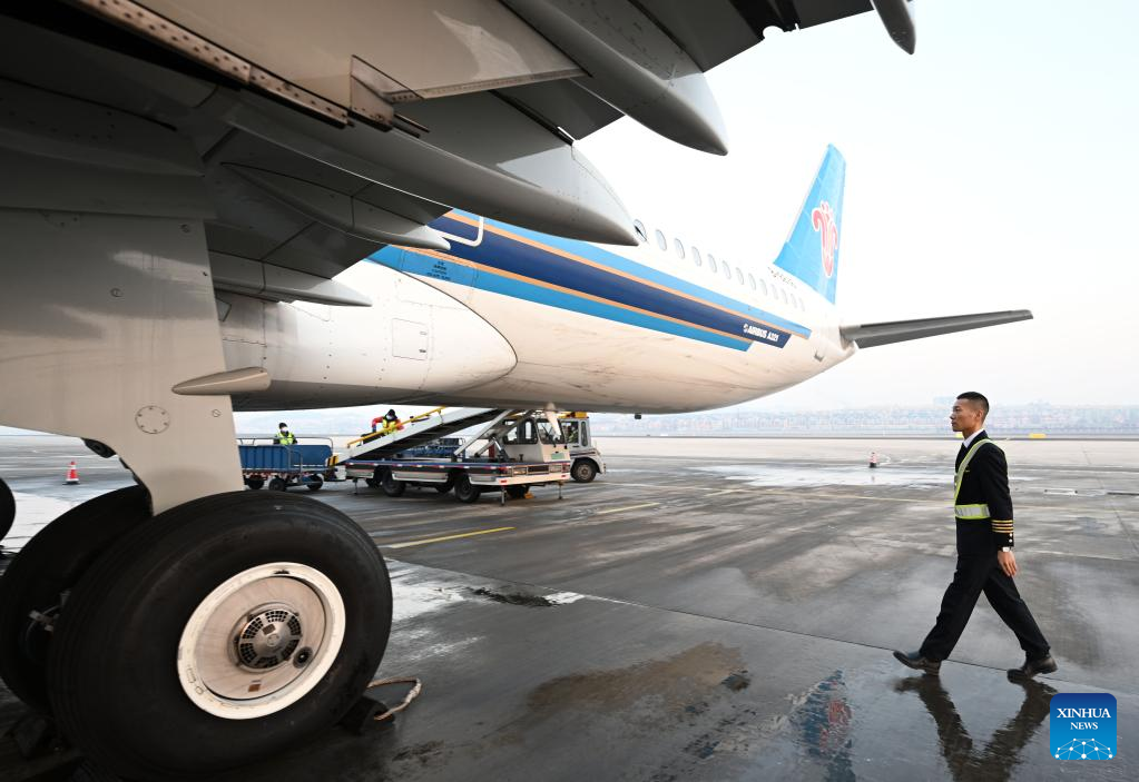 Ma Baoli patrols around the airplane before takeoff in Dalian, northeast China's Liaoning Province, Feb. 4, 2023. (Xinhua/Jin Liangkuai)