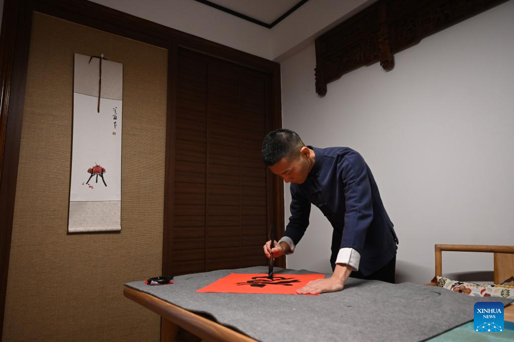 Ma Baoli writes Chinese calligraphy at home in Dalian, northeast China's Liaoning Province, Feb. 3, 2023. (Xinhua/Fang Xin)