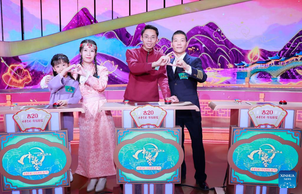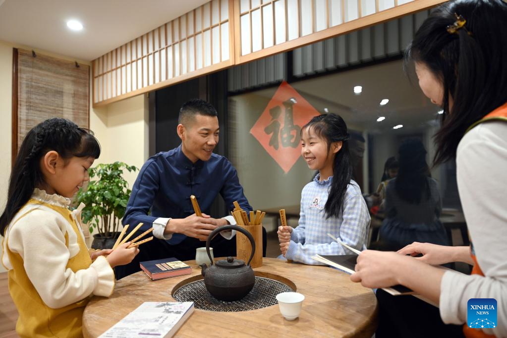 Ma Baoli (2nd L) plays an ancient poetry citing game with his children at home in Dalian, northeast China's Liaoning Province, Feb. 3, 2023. (Xinhua/Fang Xin)