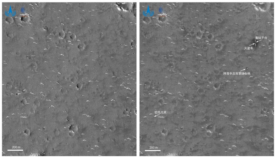 An image released by the China National Space Administration (CNSA), taken by a high-resolution camera installed on the orbiter of Tianwen-1 on June 2, 2022, shows the landing platform and the Zhurong Mars rover on the Martian surface.(CNSA/Handout via Xinhua)