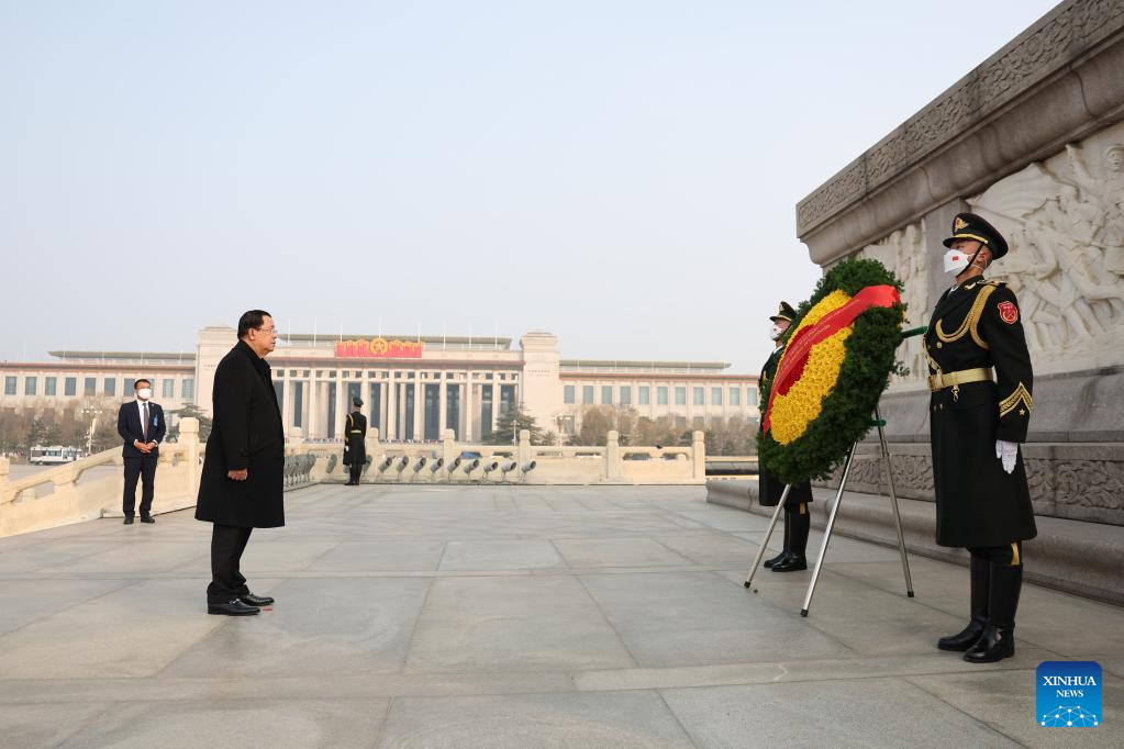 Prime Minister of the Kingdom of Cambodia Hun Sen lays a wreath at the Monument to the People's Heroes at Tian'anmen Square in Beijing, capital of China, Feb. 10, 2023. (Xinhua/Ding Haitao)