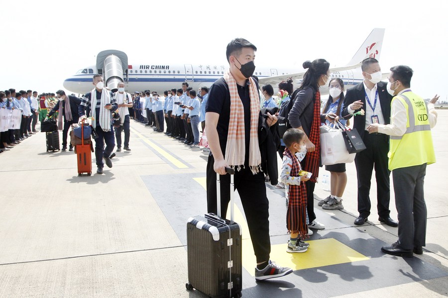 Chinese tourists arrive at the Phnom Penh International Airport in Phnom Penh, Cambodia, Feb. 7, 2023. (Photo by Phearum/Xinhua)