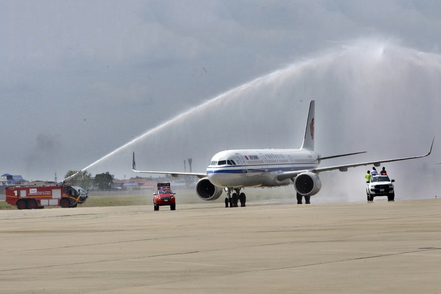 On Tuesday, Air China flight CA745, carrying some 125 Chinese tourists, arrived at the Phnom Penh International Airport from Beijing and received a water cannon salute and warm welcome from Cambodia's Tourism Minister Thong Khon.