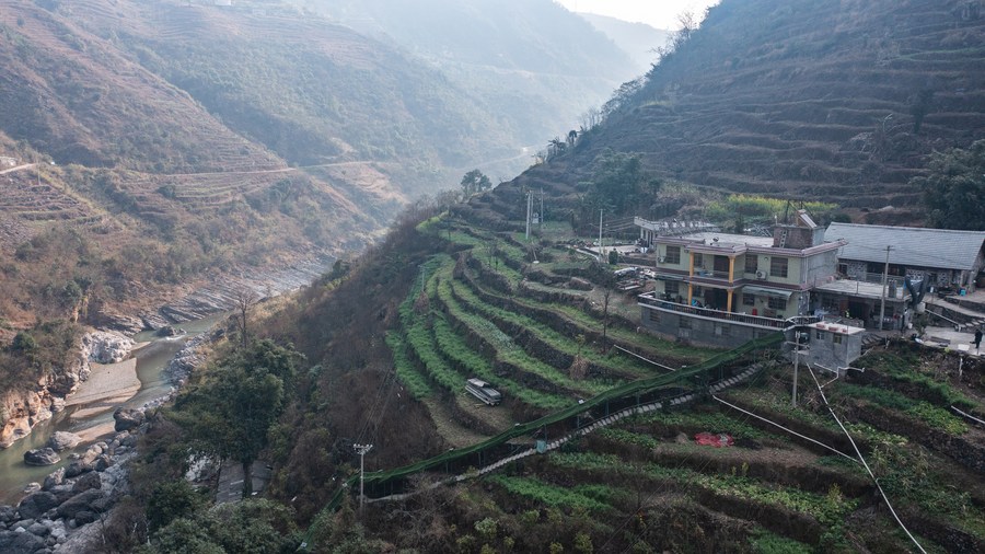This aerial photo taken on Feb. 10, 2023 shows the rural inn (R) run by Ma Xuanjun near the Beipanjiang Bridge on the Hangzhou-Ruili Expressway, southwest China's Guizhou Province. (Xinhua/Tao Liang)