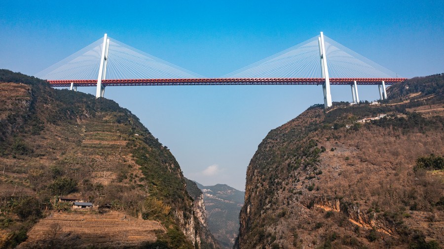 This aerial photo taken on Feb. 10, 2023 shows the Beipanjiang Bridge on the Hangzhou-Ruili Expressway, southwest China's Guizhou Province. (Xinhua/Tao Liang)