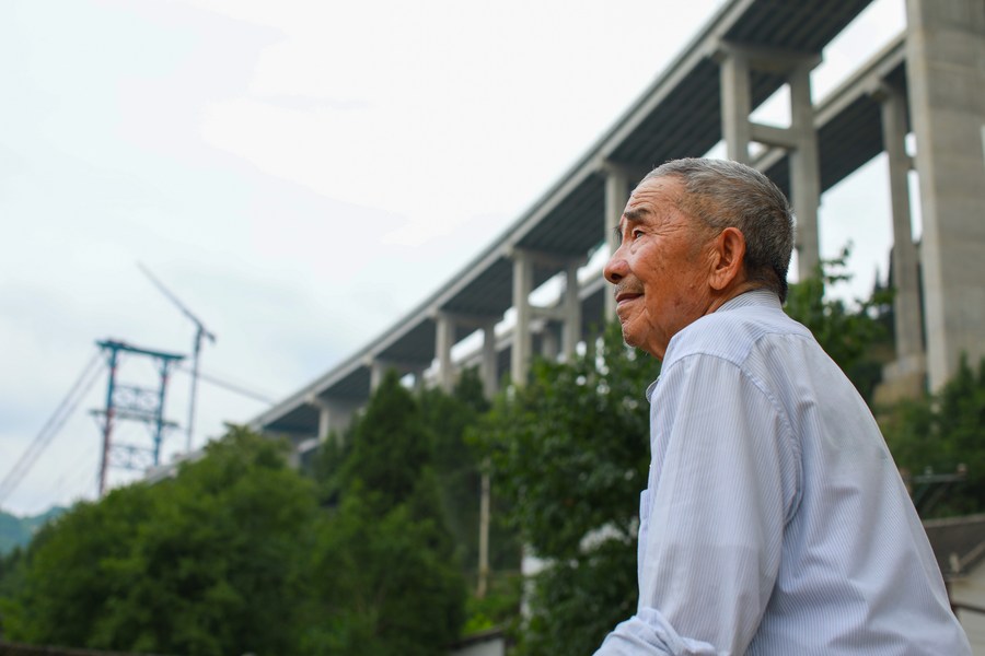 Huang Dafa, former Party chief of Tuanjian Village, sits under the Dafa Canal Bridge near the village in southwest China's Guizhou Province, June 16, 2021. (Xinhua/Liu Xu)