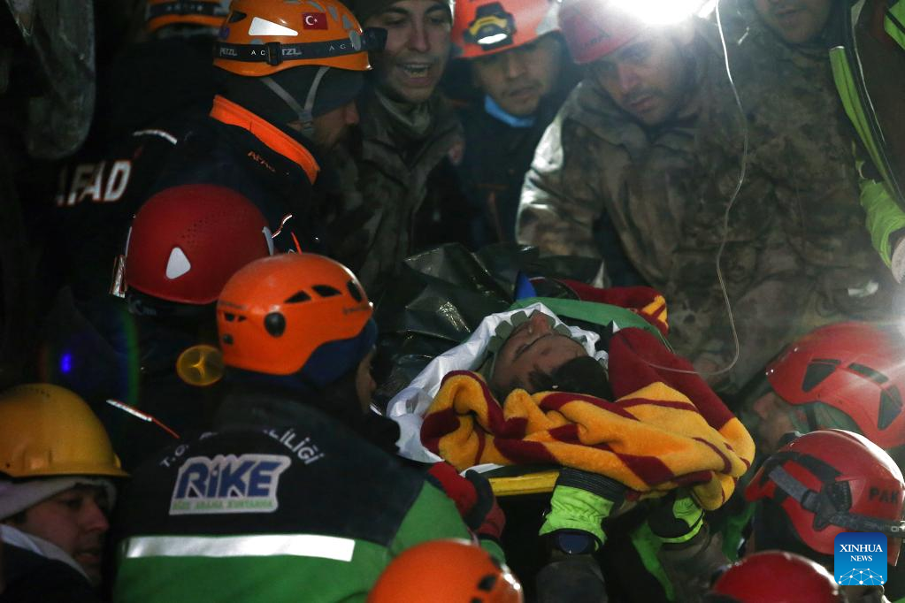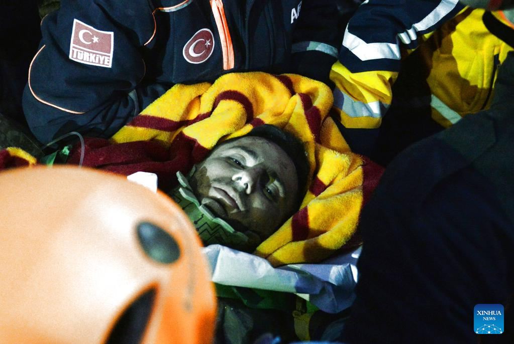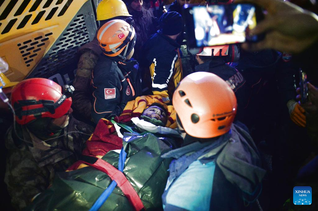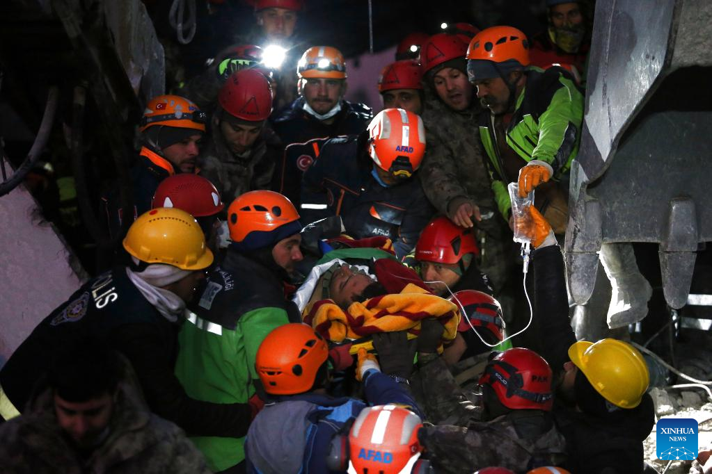 Rescuers transfer a survivor in Gaziantep, Trkiye, Feb. 10, 2023. Massive earthquakes rocked southern Trkiye and northern Syria on Monday. The death toll from Monday's devastating earthquakes has climbed to 20,213 in Trkiye, while another 80,052 injuries were reported in the country, Turkish Health Minister Fahrettin Koca announced late Friday. (Photo by Mustafa Kaya/Xinhua)