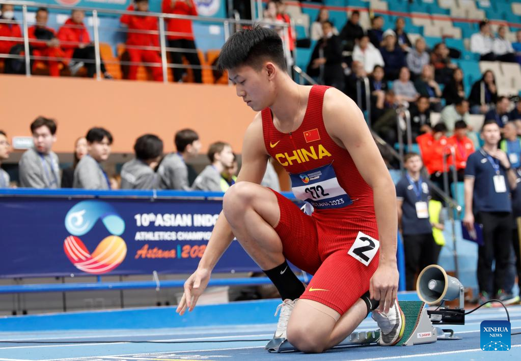 Fan Tianrui of China prepares before the men's 400m final at the 10th Asian Indoor Athletics Championships in Astana, Kazakhstan, Feb. 11, 2023. (Photo by Kalizhan Ospanov/Xinhua)