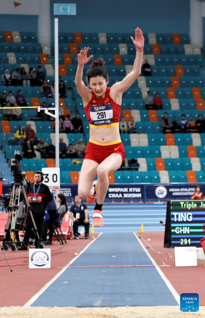 Chen Ting of China competes during the women's triple jump event at the 10th Asian Indoor Athletics Championships in Astana, Kazakhstan, Feb. 11, 2023. (Photo by Kalizhan Ospanov/Xinhua)