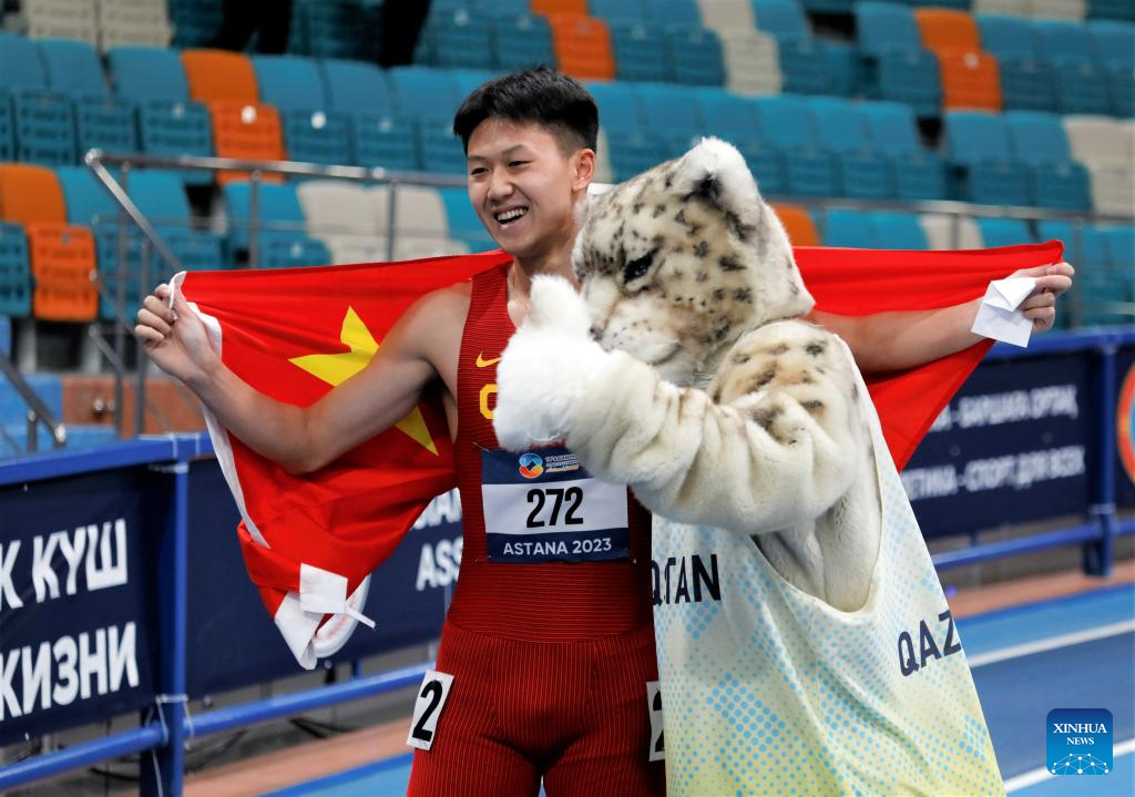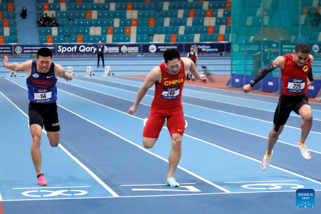 Shi Yuhao (C) of China crosses the finishing line during the men's 60m final at the 10th Asian Indoor Athletics Championships in Astana, Kazakhstan, Feb. 11, 2023. (Photo by Kalizhan Ospanov/Xinhua)
